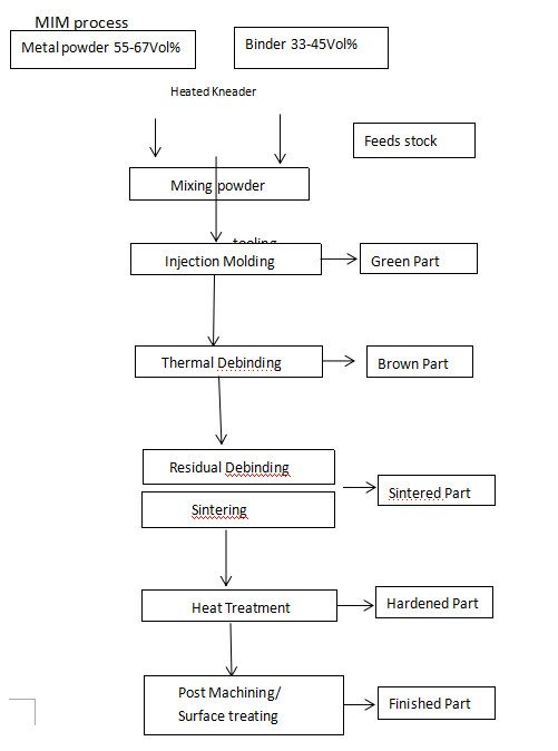 Firstly, it mixes selective powder with binder. Then, granulate the mixture and inject into the model which is needed. The mixture get the feature of polymer, which are viscidity and flow. It is helpful to modeling, mould filling and the homogeneity of powder packing. After it have taken shape, exclude the binder. Then, sinter the defatted germ. Some of the sintering products might have densifying treatment, heat treatment and machining treatment. Sintering products not only have the complex shape and high precision as the products made by plastic injection modeling method, but also have the physical, chemical and mechanical property as forge piece.